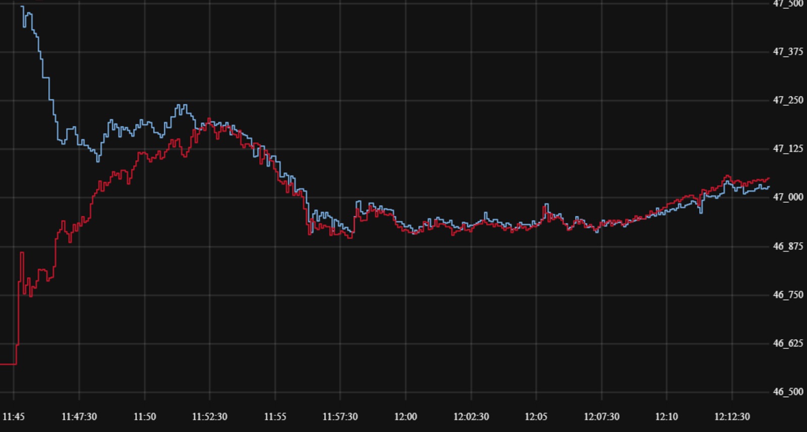 By 9:22 a.m., the premium had come down. At that time, according to SEBI, options implied a price for the index of about 47,187,[6] versus 47,176.97 for the actual index, a premium of about 0.02%. And this was below the options-implied index price at 9:15 a.m. As Jane Street was buying the underlying stocks, “temporarily pushing up or lending considerable support to the BANKNIFTY index,” the prices of options on that index were going down.